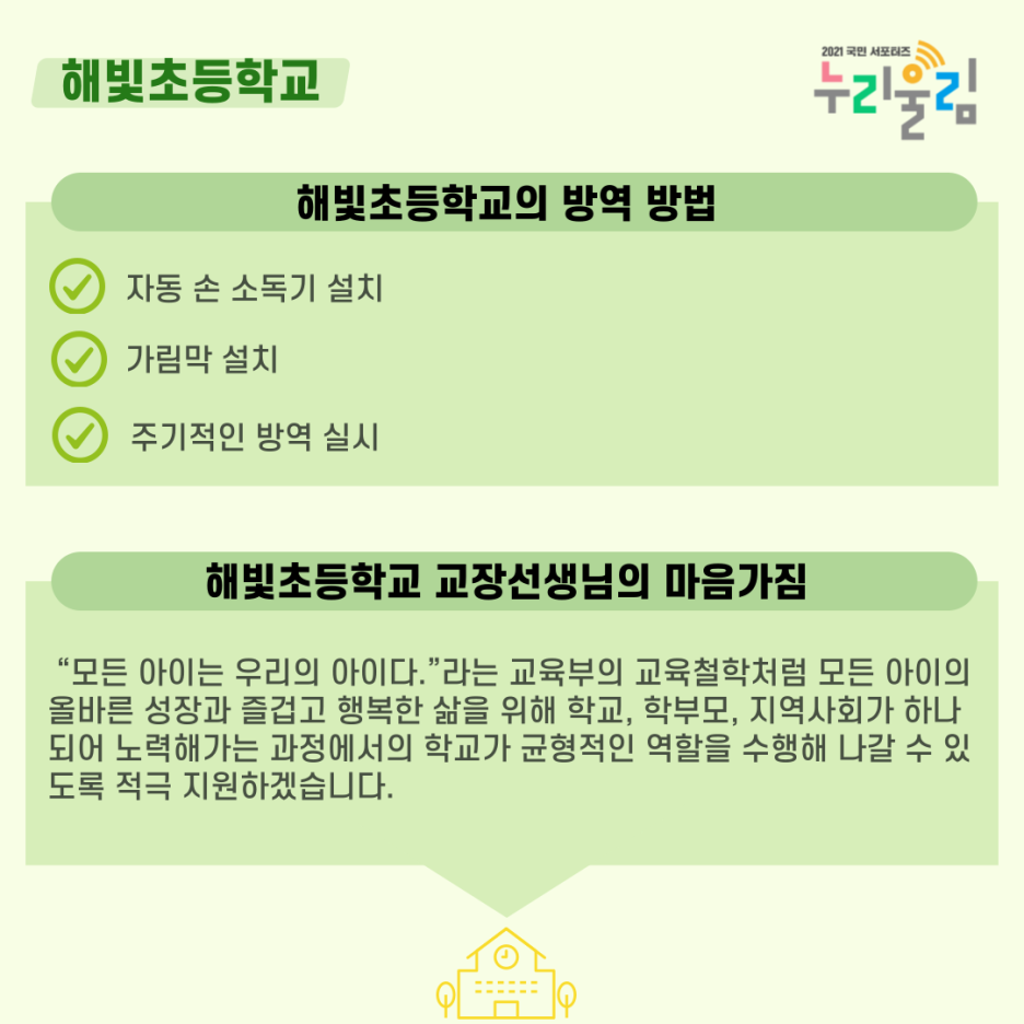 해빛초등학교의 교장 선생님께서는 기장형 초등돌봄교실을 운영하는 학교장으로서 가지고 계신 마음가짐을 말씀해 주셨는데요. “모든 아이는 우리의 아이다.”라는 교육부의 교육 철학처럼 모든 아이의 올바른 성장과 즐겁고 행복한 삶을 위해 학교, 학부모, 지역사회가 하나 되어 노력해가는 과정에서의 학교가 균형적인 역할을 수행해 나갈 수 있도록 적극 지원하겠다고 하십니다!