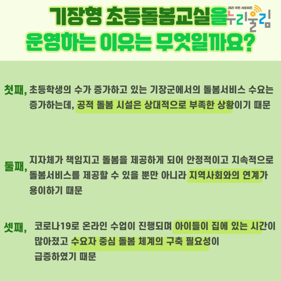 마지막으로는 코로나 19 바이러스로 온라인 수업이 진행되며 아이들이 집에 있는 시간이 많아졌다는 것에 이유를 두고 있습니다. 코로나 19 바이러스로 수요자 중심 돌봄 체계의 구축 필요성이 급증하게 되었으며, 이런 수요를 충족하기 위해 기장형 초등돌봄이 나왔다고 합니다.