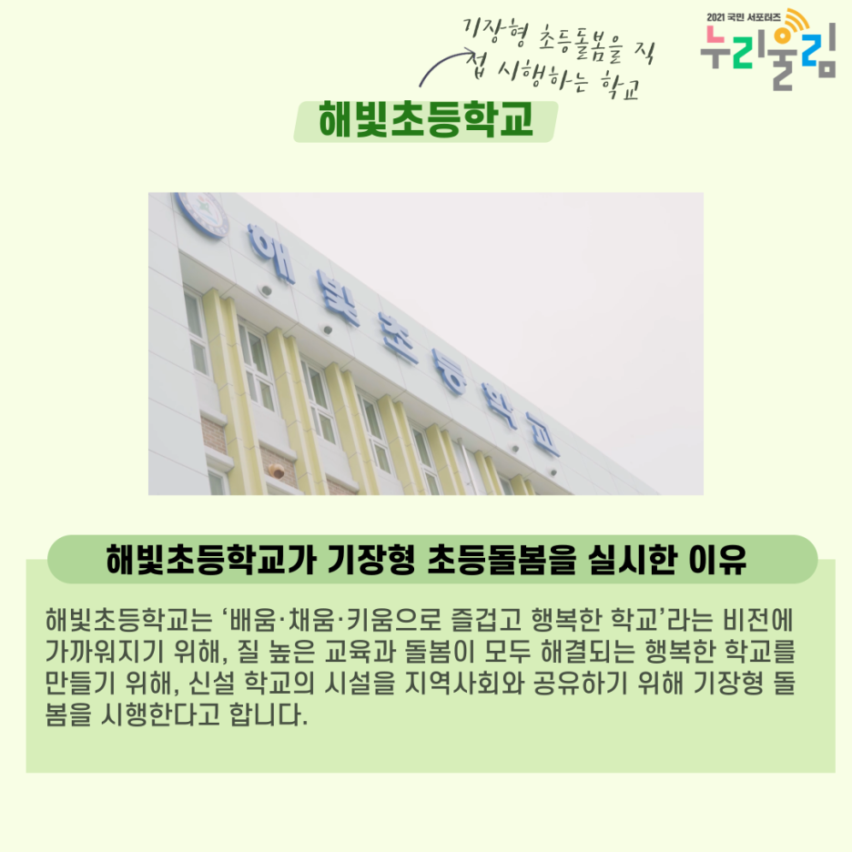 먼저, 해빛초등학교는 ‘배움·채움·키움으로 즐겁고 행복한 학교’라는 비전에 가까워지기 위해, 질 높은 교육과 돌봄이 모두 해결되는 행복한 학교를 만들기 위해, 그리고 신설 학교의 시설을 지역사회와 공유하기 위해 기장형 초등돌봄을 시행한다고 합니다.