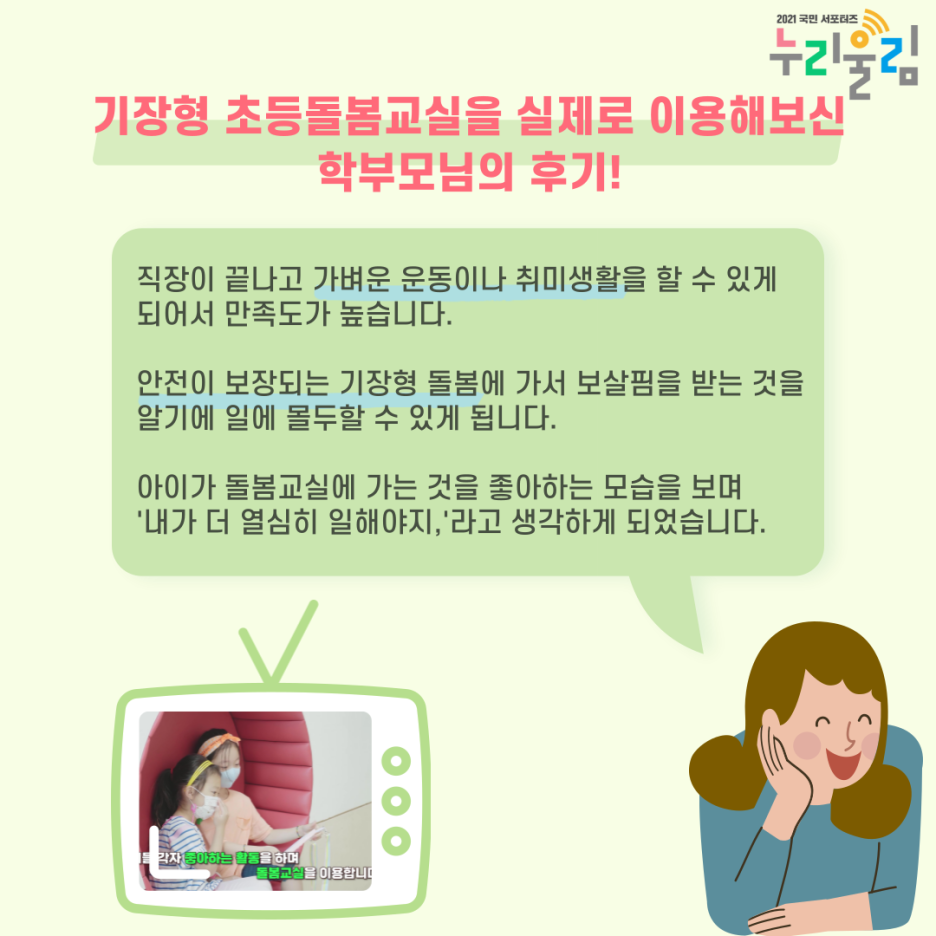 기장형 초등돌봄은 365일 연중무휴로 진행되는 돌봄서비스인 만큼, 아이들에게 기쁨을 주고 학부모에게 여가 시간을 줄 수 있는데요. 실제로 기장형 초등돌봄을 이용해보신 학부모님은 직장이 끝나고 가벼운 운동이나 취미생활을 할 수 있게 되어서 만족도가 높다는 말씀을 해주시기도 하셨습니다. 또한 기장형 초등돌봄에서 스포츠 활동을 하고 오면 “엄마 나 마지막까지 살아남았어!”라고 기쁘게 말하는 아이의 모습을 볼 수 있었다고 해요. 사실, 기장형 초등돌봄이 없었으면 일을 지속하는 것이 쉽지 않은데요. 아이가 안전이 보장되는 기장형 초등돌봄에 가서 보살핌을 받는 것을 알기에 일에 몰두할 수 있게 된다고 하셨습니다. 다른 부모님께서도 ‘안전을 중시하는 기장형 초등돌봄’ 덕분에 마음이 편했다고 하십니다. 마지막으로, 아이가 돌봄교실에 가는 것을 좋아하는 모습을 보며 ‘내가 더 열심히 일해야지.’라고 생각하게 되었고 이는 삶의 질을 상승시키는 원인이 되기도 하였다는 학부모님의 후기도 있었답니다!