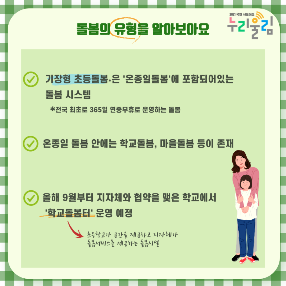 우선, 초등학생을 위해 운영하는 공적 돌봄서비스에는 어떤 것들이 있는지 설명드릴게요. 정부는 저출산 고령화 시대에 대응하기 위해 초등돌봄에 대한 국가책임을 강화하고, 학교·마을과 협력하여 초등돌봄 서비스를 확대하는 ‘온종일 돌봄’ 정책을 추진하고 있습니다. 온종일 돌봄은 학교를 마친 아이들에게 ‘언제, 어디서나 원하는 시간에’ 돌봄을 제공할 목적으로 학교와 마을이 제공하는 서비스로 그 종류에는 학교돌봄(초등돌봄교실), 마을돌봄(다함께 돌봄, 방과후 아카데미, 지역아동센터)등이 있습니다.