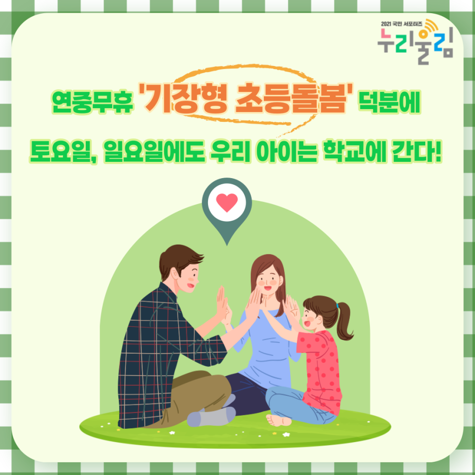“돈을 벌기 위해 경제활동을 해야 하는데, 집에 남아있을 아이가 마음에 걸려 일을 해야 할지 집에서 아이를 봐야 할지 갈등하게 돼요.” 아이를 둔 분들은 이런 고민을 많이 해보셨을 것입니다. 특히 토요일, 일요일에도 밖에서 일하시는 분들의 경우 더욱더 집에 있지 못할 때가 많아 갈등을 겪으셨으리라 생각합니다. 이렇게 일과 가족 사이에서 고민하시는 분들을 위한 돌봄 서비스가 있다고 하는데요! 특이한 점은 무려 연중무휴로 진행되는 돌봄이라는 것입니다! 아이들은 돌봄을 받으며 친구들과 교류하고 성장할 수 있고, 부모님은 안정감을 느끼실 수 있게 됩니다. 이런 돌봄 시스템, 궁금하신가요?
