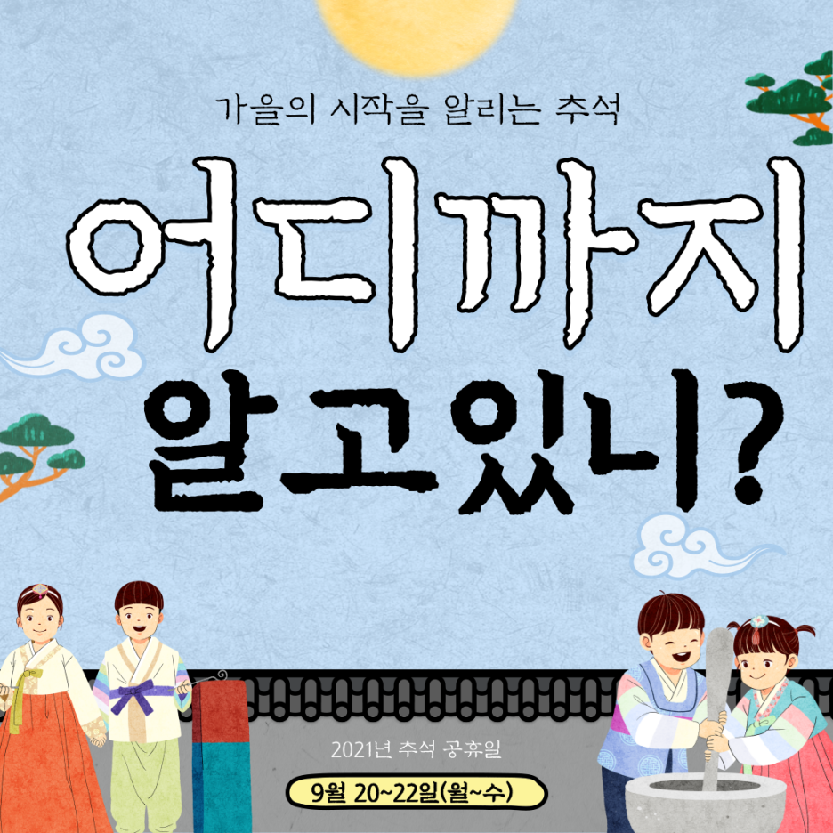 이렇게 우리가 매년 맞이하고 있는 추석의 유래와 추석에 하는 전통 놀이, 음식을 간단히 살펴보았는데요, 이번 추석은 모두 방역 수칙 잘 지키면서 보내야 한다는 것, 다들 아시죠? 모두 이번 추석, 즐겁게 보내시길 바랍니다.