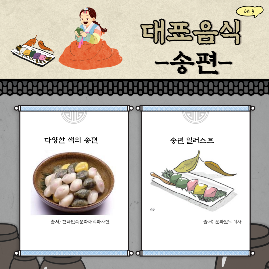 추석하면 송편이라고 할 정도로, 송편은 추석의 대표 음식이죠! 송편은 원래 ‘소나무 송‘에 ‘떡 병‘자를 써서 송병이라고 불렸답니다. 조상님들은 추석에 송편을 먹으면 솔의 정기를 받아 소나무처럼 건강해진다고 여겨 송편을 명절인 추석날에 먹었다고 해요. 또한, 송편의 가장 큰 특징은 바로 반달 모양이라고 할 수 있는데요, 이러한 송편의 반달 모양에 대한 유래에는 두 가지 이야기가 존재한답니다.