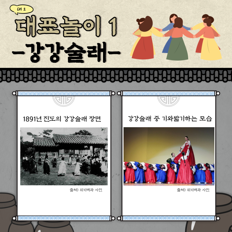 유네스코 인류무형문화유산으로 지정된 강강술래는 추석에 풍작과 풍요를 기원하기 위해 이루어지는 풍속 중 하나입니다. 강강술래는 여러 가지 형태의 놀이로 구성되어 있는데요, 그중에서도 ‘원무’는 풍요를 상징하는 보름달을 상징해 중요한 놀이랍니다. 원무란 수십 명의 사람들이 서로 손을 잡고 둥그렇게 원을 만들어 돌며 추는 춤으로, 항상 오른쪽으로 진행된다는 특징을 갖고 있어요. 이때 둥근 원을 그리며 부르는 소리가 바로 강강술래입니다. 강강술래는 전라남도 해안 지역에서부터 시작되어 전해져 내려왔고, 우리 고유의 정서, 말, 그리고 리듬이 담겨있답니다.