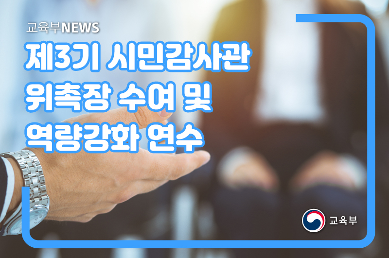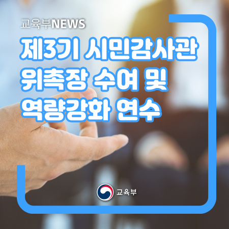 교육부는 제3기 시민감사관 위촉장 수여식과 감사역량 강화를 위한 연수를 한국교육시설안전원(서울 여의도 소재)에서 9월 27일(월)에 실시한다.