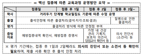 접종일부터 접종 후 2일까지는 출석인정으로 처리(결석·지각·조퇴·결과)하고, 접종 후 3일째부터는 의사 진단서(소견서)를 첨부하면 질병 사유로 인한 출결 처리가 된다.