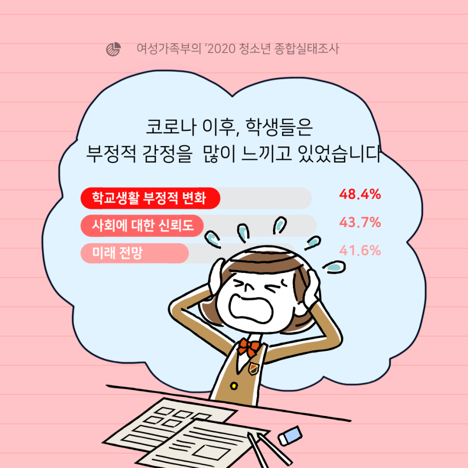 올해 6월 교육부가 발표한 ‘2020년 국가수준 학업성취도 평가’에 따르면 코로나19에 따른 일상적인 학교생활의 어려움으로 2019년보다 학력이 저하되었음을 확인할 수 있었습니다. 또한, 눈여겨 볼 것은 학력저하만큼 학생들이 정서적으로 어려움을 겪고 있다는 점입니다. 이번 학업성취도 평가 설문조사에서, 2013년부터 2019년까지 꾸준히 증가세를 보이던 학교생활 행복도도 낮아진 것으로 나타났고, 교과별 자신감, 흥미 등 교과기반 정의적 특성도 2019년보다 낮아진 것으로 나타났습니다. 여성가족부의 ‘2020 청소년 종합실태조사’ 결과 역시 많은 학생들이 코로나 이후의 학교생활에 대해 부정적으로 변했다고 응답했습니다. 아이들이 다시 마음을 열고 행복한 생활을 할 수 있게 도움이 필요한 상황인데요.