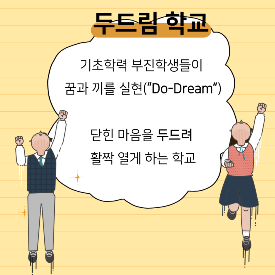 혹시 ‘두드림 학교’라는 말 들어보셨나요? 두드림 학교는 두 개의 의미를 담고 있는데요. 첫 번째는 영어 “Do-Dream”의 의미로 기초학력 부진 학생들이 꿈과 끼를 실현(“Do-Dream”)할 수 있게 만들어주는 학교라는 뜻입니다. 두 번째는 우리말 “두드리다”에서 착안해 아이들의 닫힌 마음을 두드려 활짝 열게 하는 학교라는 의미예요. 두드림 학교는 학습 부진을 초래한 원인을 다각적으로 분석해 적절한 맞춤형 프로그램을 제공하고 학생 스스로 성장 동력을 회복할 수 있도록 지원하고 있어요!