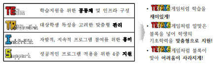 테트리스반의 이름은 여러 의미를 담고 있는데요. 먼저 학습지원대상 학생들이 학습을 테트리스 게임처럼 재미있게 할 수 있도록 돕겠다는 뜻이에요. 또한, 게임에서 모양에 따라 블록을 채워 넣듯이 학생에게 맞춤형 지원을 하겠다는 의미도 담고 있죠. 최종적으로 블록이 맞아 단이 사라지듯 학습을 방해하는 어려움이 사라지길 바라는 마음이 담겨 있어요. 또한, 학습지원을 위한 공동체 구성(TEam), 대상 학생의 맞춤형 관리(TReatment), 지속적 참여를 위한 흥미(Interest), 여러 주체의 다중 지원(Support)을 의미하기도 한답니다.
