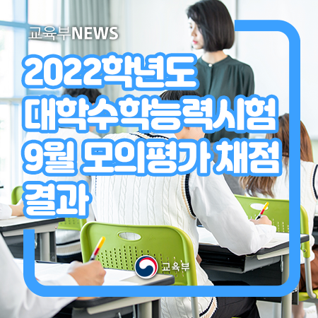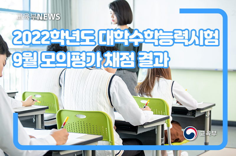 한국교육과정평가원(원장 강태중)은 지난 9월 1일(수) 전국적으로 실시된 2022학년도 대학수학능력시험(이하 수능) 9월 모의평가 채점 결과를 9월 30일(목)에 수험생들에게 통지하였다. 개인별 성적통지표는 접수한 곳(재학 중인 학교, 시험 지구 교육청, 출신 학교 등)을 통하여 수험생에게 교부하였다. 아울러 수험생 진학 지도를 위해 「영역/과목별 등급 구분 표준점수 및 도수분포」자료도 공개하였다.