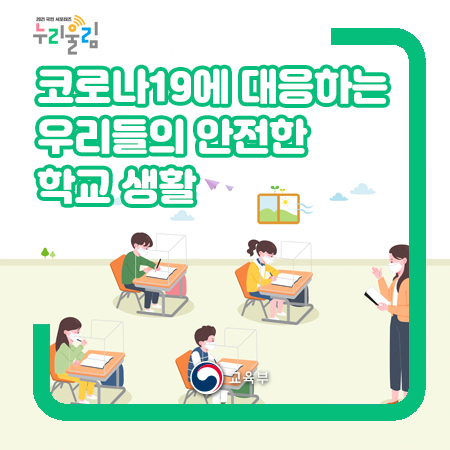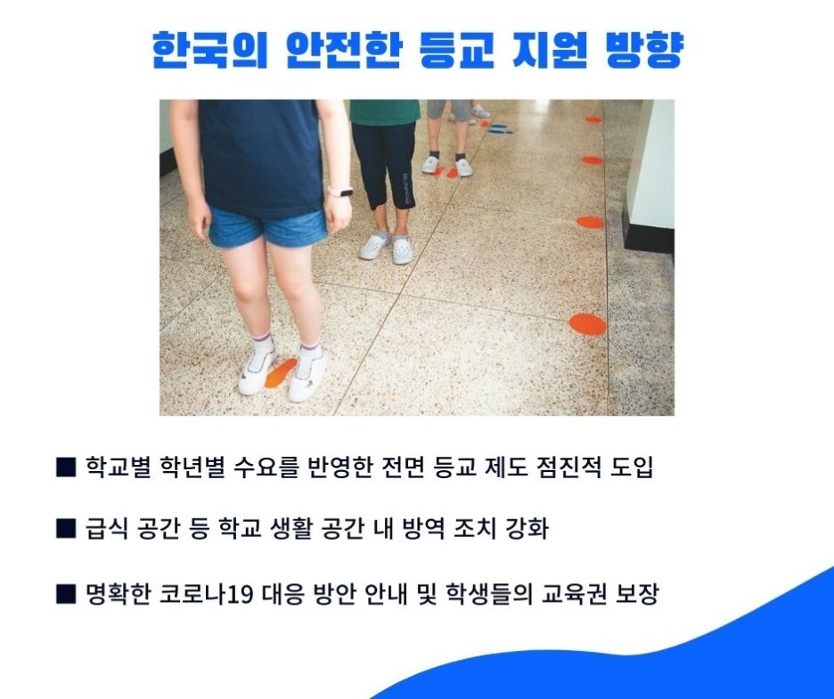 이상으로 코로나19 상황에서도 학생들의 교육권과 안전한 등교를 보장하는 사례에 대해 알아보았습니다. 급식실과 수업 공간에 칸막이를 설치하고, 시차 등교제를 운영하는 등 안전한 대면수업을 위해 열심히 노력하고 있다는 사실을 알 수 있었는데요. 안전한 등교를 위해 학교현장에서 노력하고 있는 만큼, 국민 여러분들도 방역수칙을 잘 지켜 안전한 등교 제도가 잘 시행될 수 있으면 좋겠습니다.