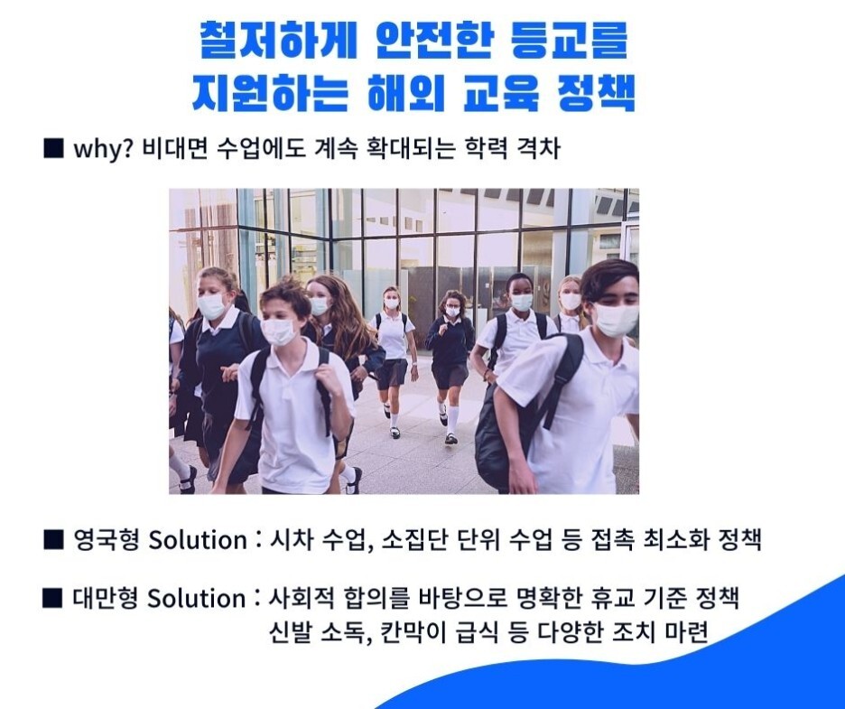 이런 문제를 해결하기 위해서 교육부는 등교 확대를 위해 안전한 등교를 실시할 수 있는 제도적 기반을 마련하고 있습니다. 방역수칙을 철저히 준수한 안전한 학교생활을 실현하고 있는데요. 영국의 경우에도 전면 등교를 원칙으로 하되, 원격 수업을 부분적으로 도입하는 방식으로 교육권을 최대한 보장하기 위해 노력하고 있습니다. 영국과 대만 사례를 통해 코로나19 시대에 교육권과 안전을 모두 보장하는 교육 방식을 알아보고, 한국의 교육 회복 정책에 대해서도 함께 알아보겠습니다.