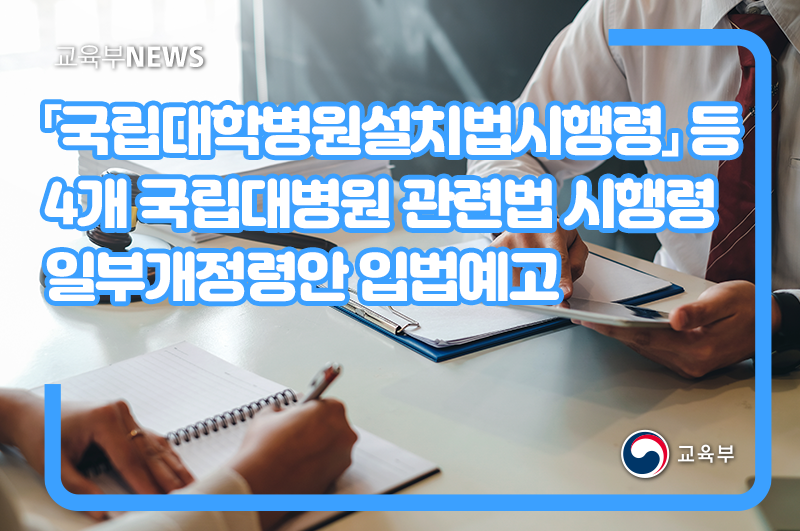 교육부(부총리 겸 교육부장관 유은혜)는 「국립대학병원설치법 시행령」등 4개 법률 시행령(이하 ’시행령‘)의 일부개정령안을 10월 5일(화)부터 11월 15일(수)까지 41일간 입법 예고한다.