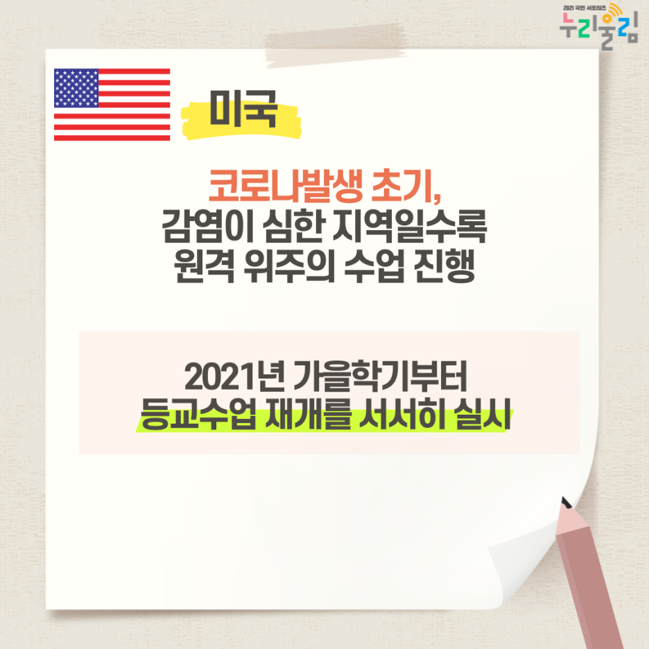 미국은 코로나19 사태가 심각해지면서 확진자가 발생한 학교 혹은 지역 감염 수준이 높은 지역 학교에 임시 폐쇄 조치를 권고하였습니다. 이후로는 각 지역 교육 당국은 감염 상황을 고려하여 등교수업과 원격수업을 병행해 왔는데요. 그러나 백신 공급이 확대되면서 2021년 가을학기에는 다시 서서히 등교수업을 재개하고 있습니다.