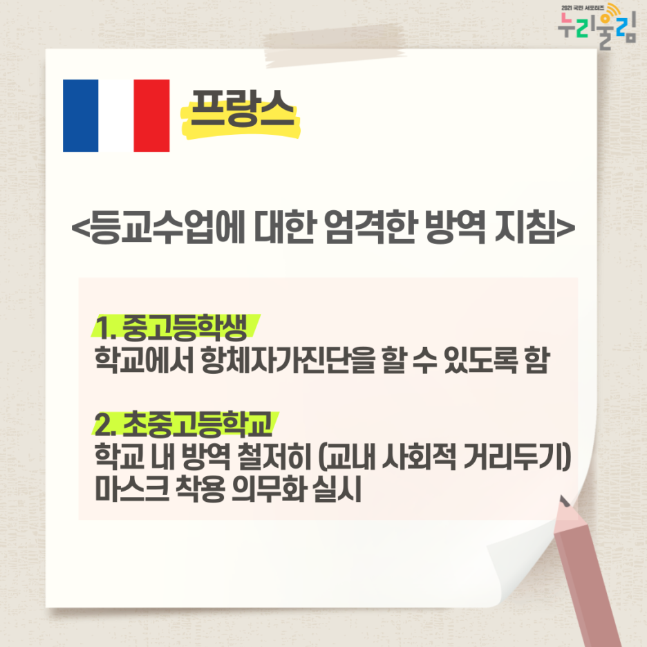 먼저 살펴볼 나라는 프랑스입니다. 프랑스는 지금까지 다른 나라들과 유사하게 여러 번 코로나19 대유행을 겪었습니다. 세 차례의 대유행 시기마다 확산세를 멈추기 위해 전국 혹은 대도시 중심으로 봉쇄를 결정하게 되면서 학생들의 등교도 중단되었는데요. 그럼에도 프랑스 교육부는 지속적인 교육을 위한 등교수업에 의지를 보여 왔습니다.
