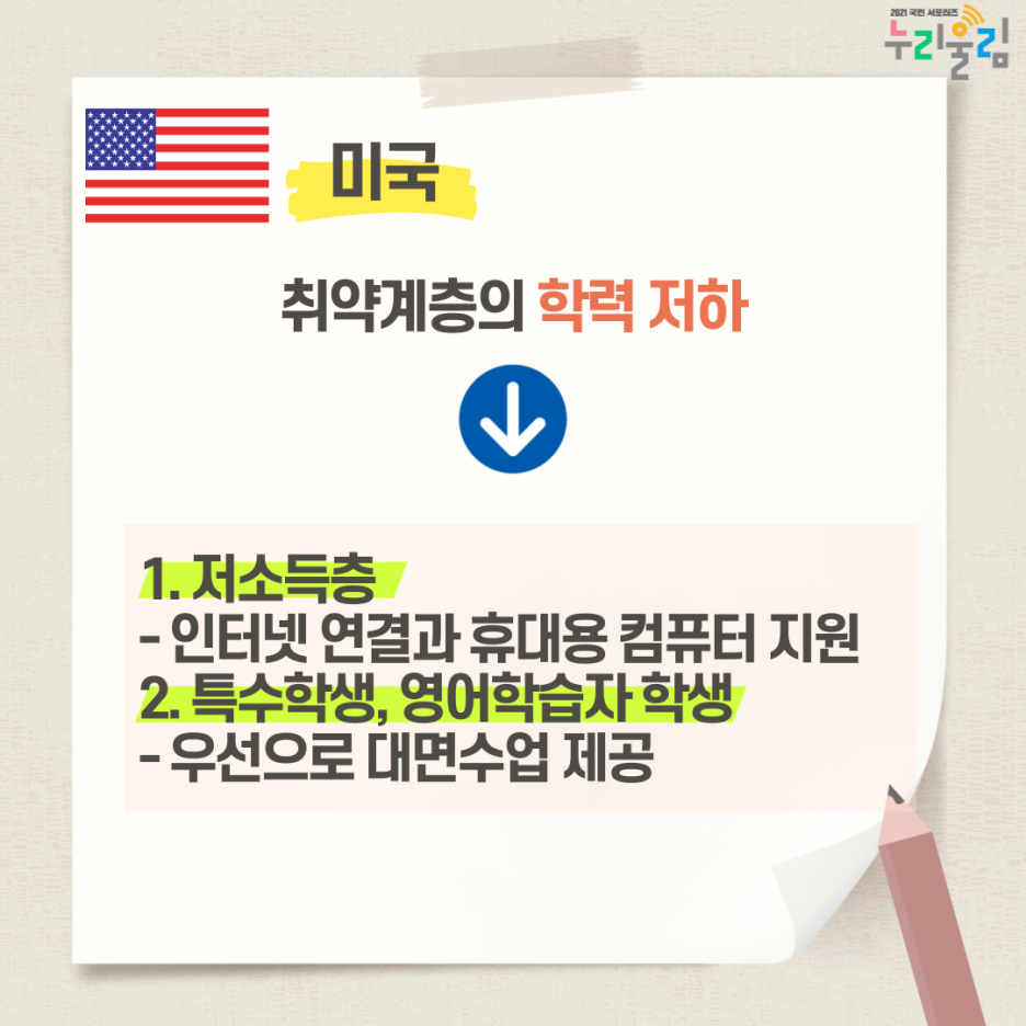 코로나19 상황에서 미국의 교육부가 우려했던 것 또한 학생의 학력 저하에 대한 걱정이었을 것입니다. 특히 등교수업의 어려움으로 인한 학력 저하는 취약계층에게 더 가혹하게 나타났습니다. 이에 대해 미국 각 지역 교육 당국은 저소득층 가정의 인터넷 접근성을 향상하기 위해 무선인터넷 연결과 휴대용 컴퓨터를 지원하였고 특수학생과 영어학습자 학생에게 우선적으로 대면수업을 제공하기도 하였습니다.