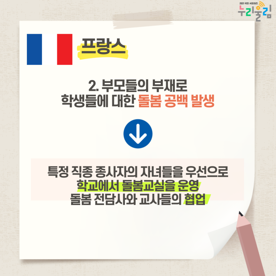 두 번째로, 부모들의 재택근무가 이루어지지 않는 가정 환경에서는 어린 학생들에 대한 돌봄 공백이 발생한다는 이유 때문이었습니다. 이는 프랑스 교육부가 가장 염려했던 부분이기도 했습니다. 프랑스 교육부는 등교수업이 중단될 때마다 보건분야 종사자, 경찰 및 소방관 등 지속적인 출근이 요청되는 직종 종사자의 자녀들을 우선적으로 학교에서 돌봄교실을 열어 운영하였습니다. 프랑스에서는 교사뿐만 아니라 교육지원업무를 하는 인력도 공무원이다 보니 이들과 직접 협의를 해야 교육활동이 진행될 수 있는 구조이기 때문에 돌봄 전담사와 교사들의 협업 속에서 돌봄 공백을 채워 나가기 위해 노력했다고 해요.