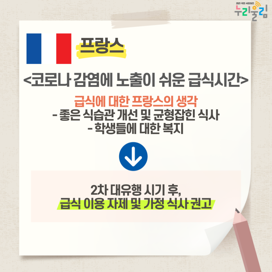학교에서 보내는 시간 중 코로나 감염에 노출되기 가장 쉬운 시간은 바로 급식시간이라고 할 수 있는데요. 프랑스에서 학교 급식이란 좋은 식습관과 균형 잡힌 식사에 대한 교육이자 학생들에 대한 최소한의 복지라는 의미를 담고 있을 정도로 학교 교육에서 중요한 부분을 차지하고 있습니다. 이러한 인식으로 인해 코로나19 상황 속에서도 급식은 빠짐없이 진행되었습니다. 하지만 2차 대유행 시기 이후 마스크를 착용할 수 없는 시간에는 감염 위험이 높아진다는 것을 인식하여 최대한 급식 이용을 자제하고 가정에서 식사를 할 수 있도록 해 줄 것을 학부모들에게 권고하였습니다.