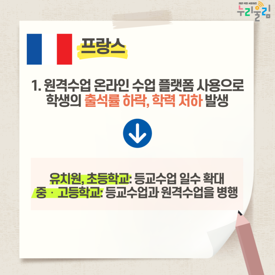 첫 번째로는 원격수업 기간에 학생들의 출석률이 하락하고 학력 저하가 발생하였기 때문입니다. 프랑스는 등교수업이 불가피하게 중지된 이후로 등교수업과 원격수업을 병행하게 되었는데요. 원격수업을 위해 온라인 수업 플랫폼을 통해 수업 자료와 동영상 강의를 제공하고 공영방송 채널과 인터넷 사이트의 교육자료를 활용하여 수업을 진행하였습니다. 하지만 학생들이나 학부모들은 학습 집중도 및 수업 질이 저하되어 등교수업에 비해 학습이 제대로 이루어지지 않는다는 문제를 제기하였습니다.