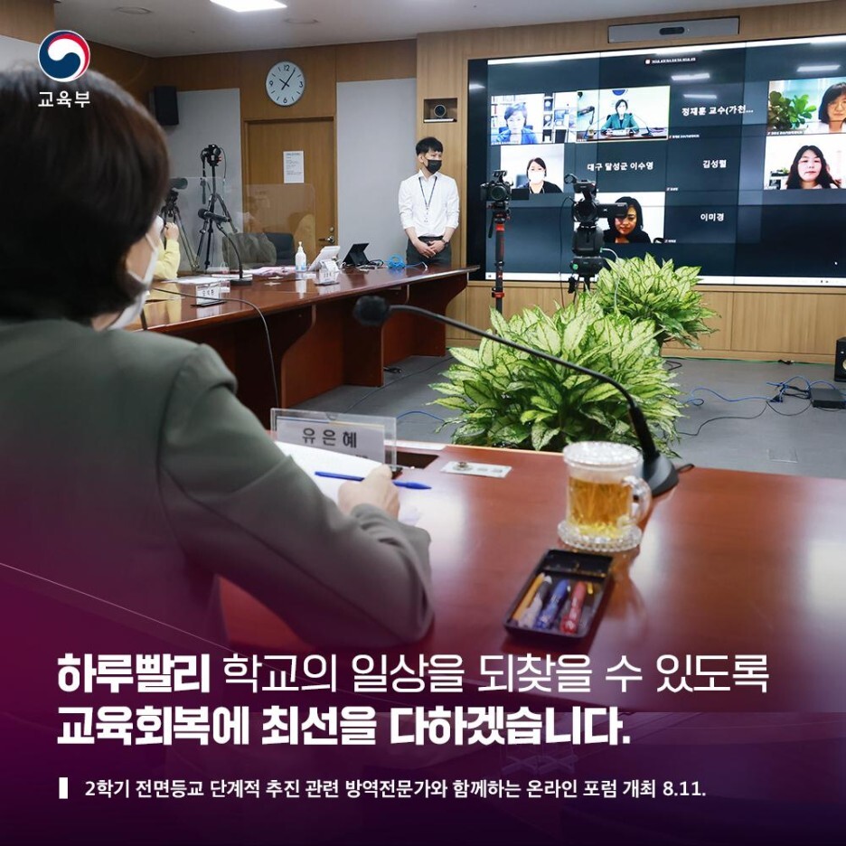 또한, 2학기 전면등교 단계적 추진을 위해 방역 전문가와 온라인 포럼을 열기도 하고 학교 방역 전문가와 자문회의를 개최하기도 하였습니다.