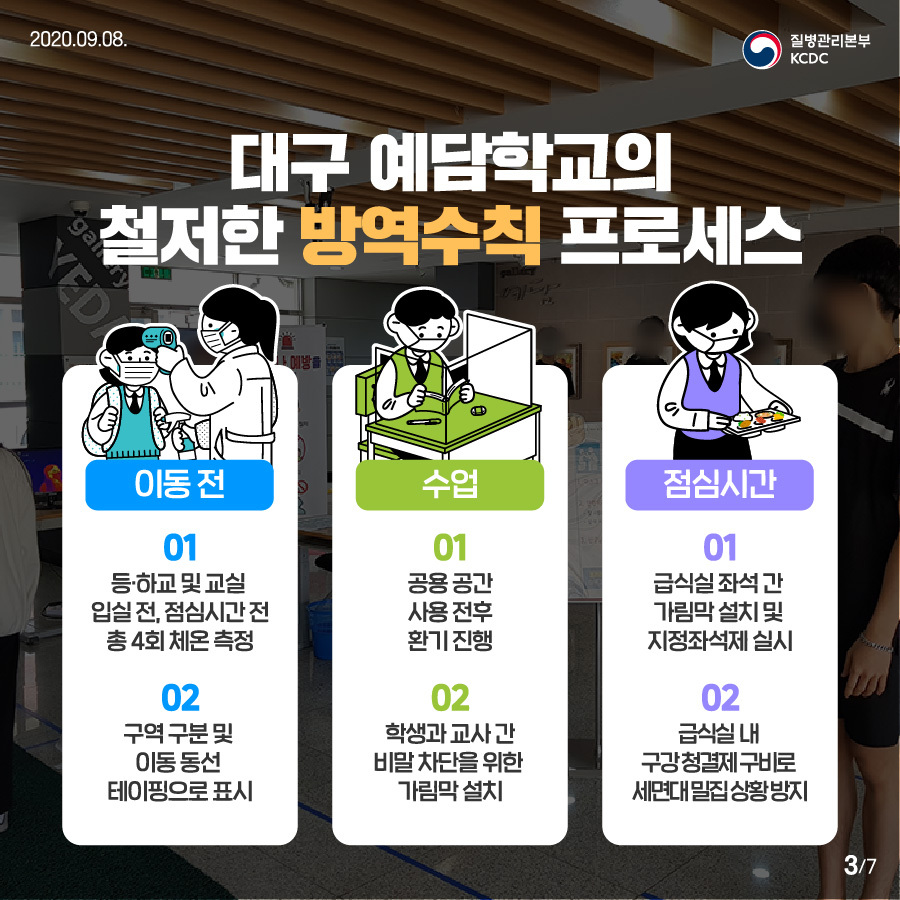철저한 방역 수칙을 지키고 있는 학교로 ‘대구예담학교’를 말할 수 있을 것 같습니다. 예담학교에서는 등‧하교 및 교실 입실 전과 점심시간 전에 총 4회 체온 측정을 실시하고 있습니다. 구역 구분과 이동 동선을 테이핑함으로써 최대한 교사 및 학생 간의 접촉을 피할 수 있도록 거리두기를 실천하고 있답니다.