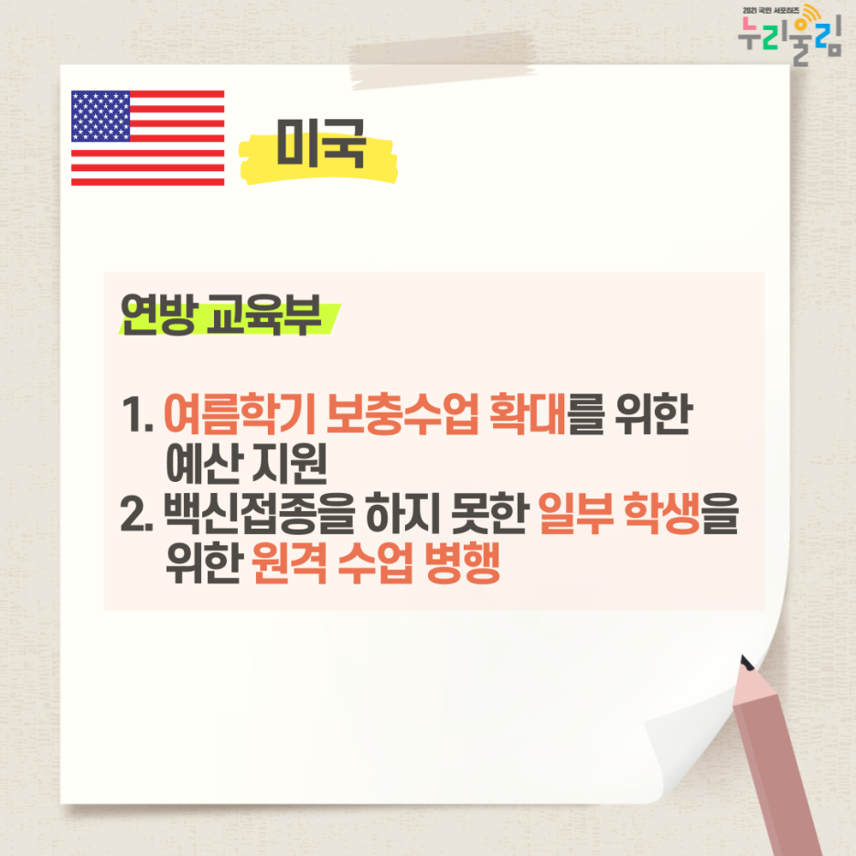 또한, 2021년 여름학기를 시작으로 많은 주 정부와 지역 교육당국이 원격수업과 대면수업을 대폭 확대함으로써 학생의 학력 저하를 최소화하고자 노력하고 있습니다. 연방 교육부 역시 여름학기 보충수업 확대를 위해 예산을 지원하고 있는데요. 물론 여전히 코로나19의 위험이 계속되고 있다는 점을 고려하여 백신 접종을 하지 못한 일부 학생을 위한 원격수업은 병행되고 있다는 점이 현재 미국 교육의 특징이라고 할 수 있을 것 같습니다.