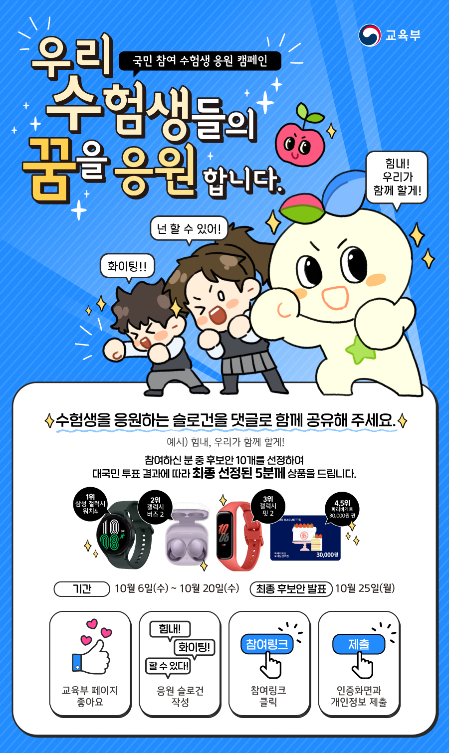 | 국민 참여 수험생 응원 캠페인 <수험생 응원 슬로건, 최종 투표가 시작됩니다!> (0) | 2021.10.25 |