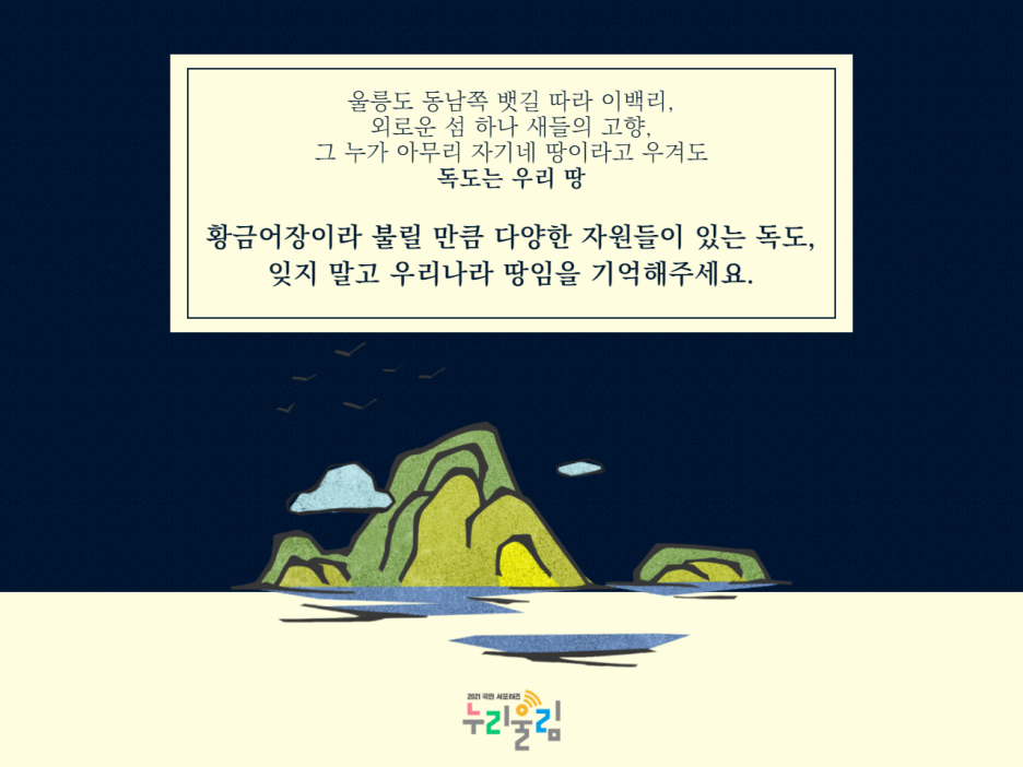 우리가 많이 알고 있는 ‘독도는 우리땅’의 가사처럼 독도의 날 이후에도 황금어장이라 불릴 만큼 다양한 자원들이 있는 독도가 우리나라 땅임을 기억해주세요!