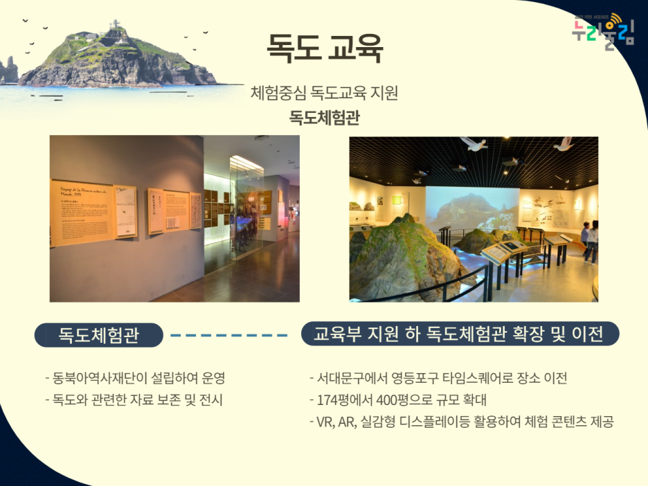 독도체험관은 독도 체험 학습 공간을 더 발전시키고자 교육부 지원하에 확장 및 이전을 진행합니다. 서대문구에서 영등포구 타임스퀘어로 이전하면서 규모도 174평에서 400평으로 확 늘린다고 하는데요. 더불어 최근 첨단 기술을 활용하여 VR, AR, 실감형 디스플레이 등을 활용하여 더 다양한 체험 콘텐츠를 만들어 풍부한 전시와 체험이 가능할 수 있도록 구축한다고 하니 이전 후의 독도체험관의 모습도 기대가 됩니다!