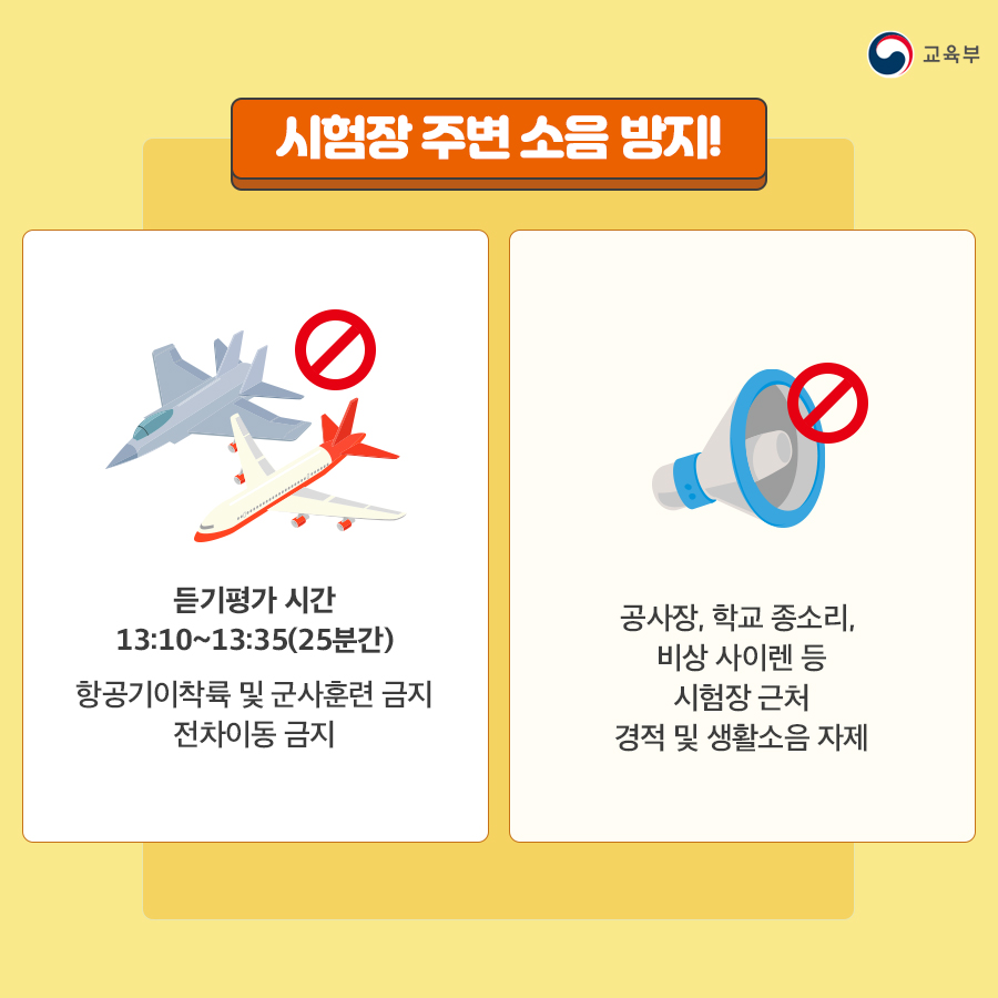 공사장, 학교 종소리, 비상 사이렌 등 시험장 근처 경적 및 생활소음 자제