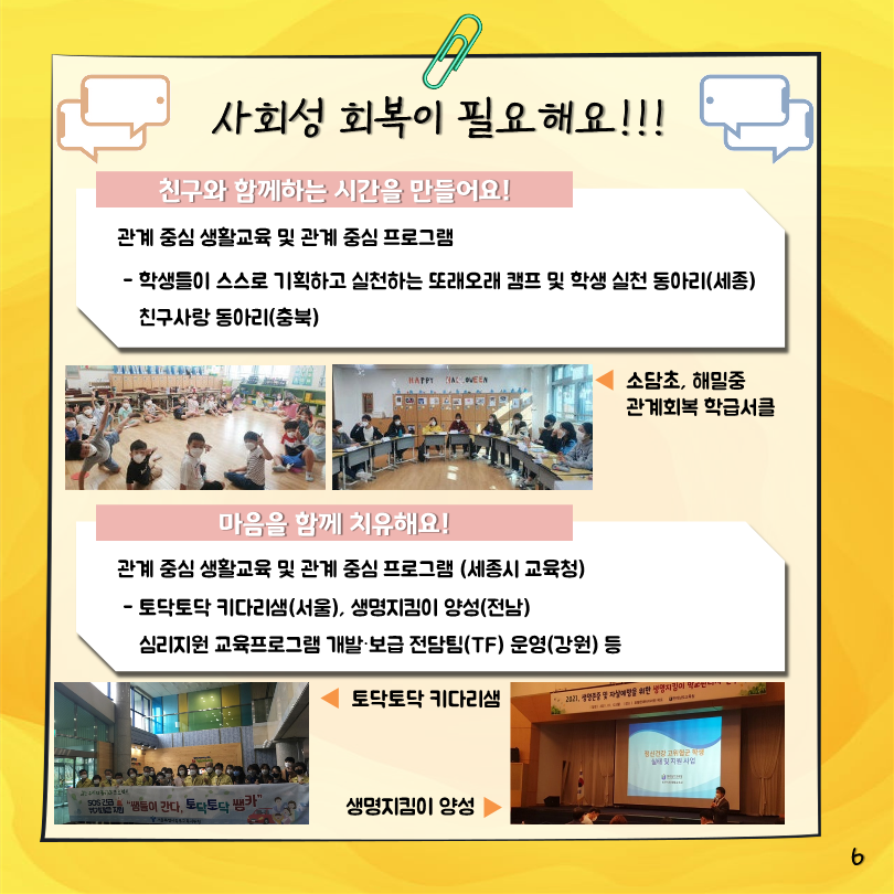 세종시교육청에서는 관계성 회복을 위해 관계 중심 생활교육과 프로그램을 운영한다고 밝혔는데요. 특히 또래오래 캠프와 학생 실천동아리는 학생들이 스스로 기획하고 실천하는 프로그램으로 이 프로그램을 통해 아이들의 몸과 마음이 따뜻하게 부풀어 오를 것 같습니다. 그 밖에도 경기도 교육청에서는 관내 고등학교 졸업생을 활용한 선배 동행 심리지원 프로그램을 운영한다고 합니다.