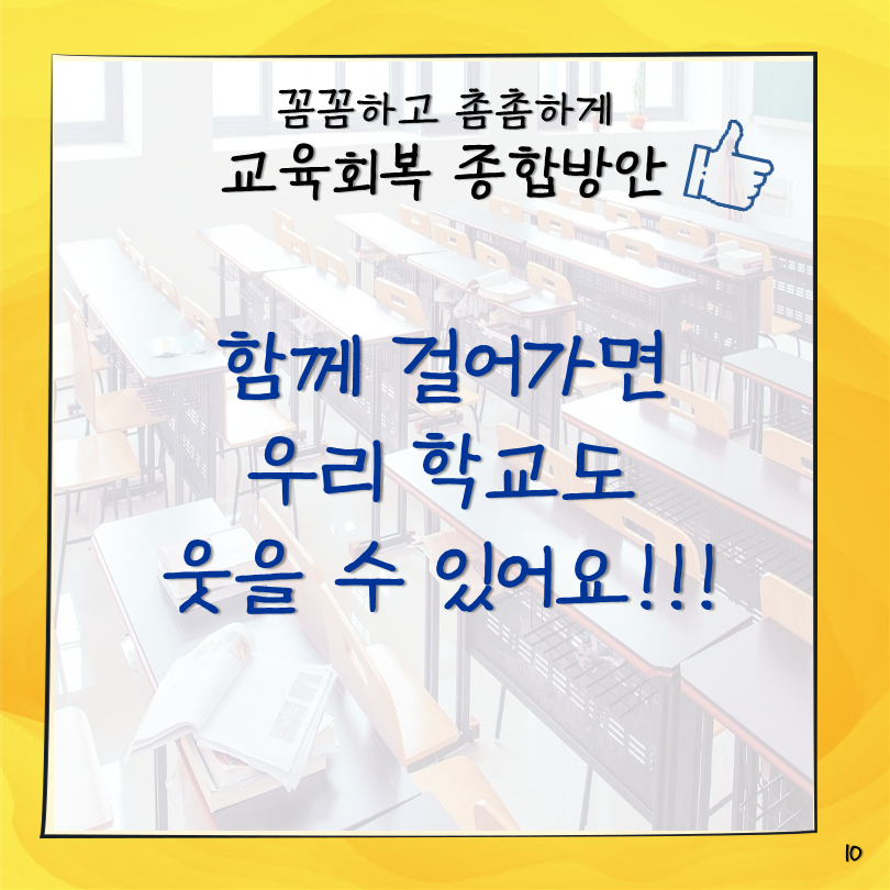 교육회복을 위해 함께 걷는 이 길은 어쩌면 더 빨리 목적지에 다다르지 않을까 생각해봅니다. 우리 아이들이 학교에서 맘껏 공부하고 웃을 수 있는 그 날을 손꼽아 기다리며, 아이들을 마주하는 모든 분들을 응원하겠습니다.