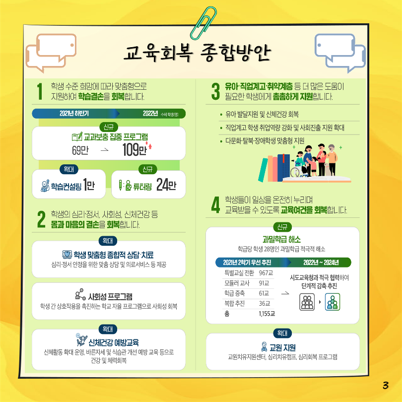 지난 6월, '2학기에 학교에서 무엇을 집중 지원해야 하는가'라는 설문에 교원·학부모·학생이 '학습결손 해소를 위한 교과학습 보완'이 가장 필요하다고 답했습니다. 이와 관련하여 교육부에서 ‘2020년 국가수준 학업성취도 평가 결과 및 학습 지원 강화를 위한 대응 전략’ 발표에 따른 후속 조치로, 7월 29일 코로나19 장기화에 따른 학습·심리·사회성 결손 극복을 위한 「교육회복 종합방안」 기본계획을 발표했습니다.