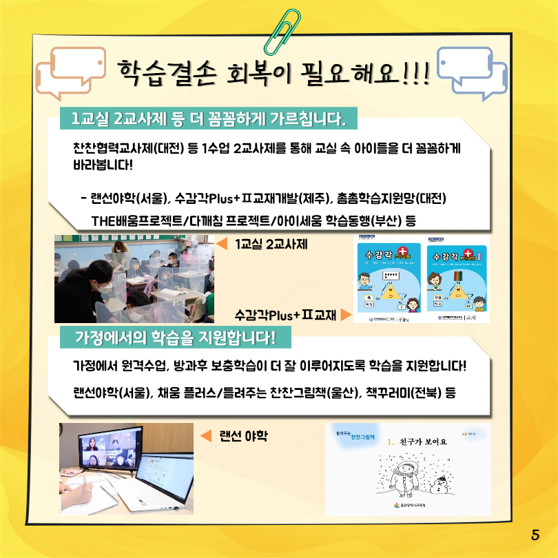 서울시교육청에서는 랜선 야학을, 울산시교육청에서는 채움 플러스 국어/수학, 들려주는 찬찬그림책을 제작하여 배포하였습니다. 가정에서 원격수업과 방과후 학습을 지원하여 학생들의 학 결손을 보완하고자 노력하고 있습니다. 학교 공간을 뛰어넘어 배움을 촉진하는 이러한 정책들을 통해 앞으로 학업에 있어 소외받는 친구들이 없기를 우리 모두 소망합니다!