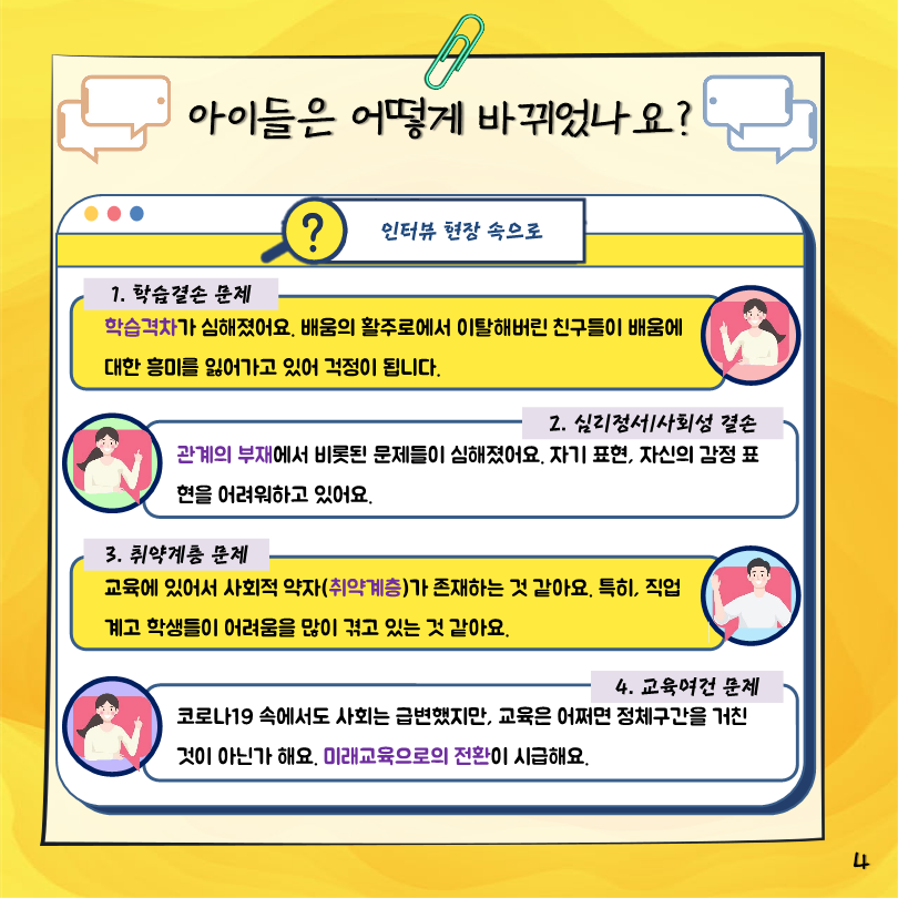 | 교사 D | 교육회복이란 터닝포인트다. 어쩌면 비대면 상황 속에 잠시 멈춰있던 교육 현장은 발 빠르게 뛰어가는 사회의 흐름에 잠시 뒤처졌을지 모릅니다. 하지만 이 시간을 슬기롭게 해결한다면, 더 높이 뛰어오를 수 있는 도약의 발판이 될 것입니다. |