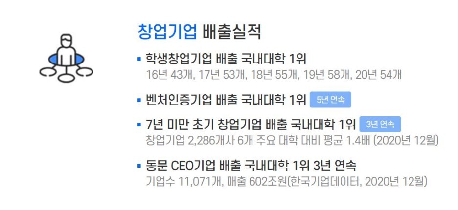 한양대학교는 창업 교육 최우수 대학, 벤처기업가 배출 1위 대학, 학생 창업자 배출 1위 대학으로 선정되는 등 화려한 이력을 갖고 있어요. 한양대학교는 화학 분야 사업을 운영하는 ㈜솔리비스를 비롯해 584개의 기업을 발굴하고 육성해 왔는데요. 스타트업 자원을 위해 한양대학교 창원지원단은 동문은 물론 일반인 창업자를 대상으로 교육부터 창업 아이템 발굴 및 사업화, 투자유치 등을 실시하고 있다고 해요.