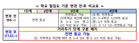 기존 1~4단계 거리두기 단계 구분은 폐지되며, 모든 지역에서 ‘전면 등교 가능’으로 학교 밀집도 기준을 변경한다.