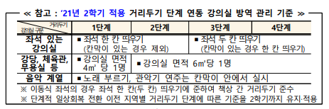 한편, 2학기 동안 강의실 방역관리 기준은 단계적 일상회복 전환 이전 지역별 거리두기 단계에 따른 기준을 유지하되, 수업 참여 기준, 통학버스 운영 기준 등 일반 방역지침보다 강화하여 적용되었던 대학 방역지침의 일부를 완화하여 적용한다.