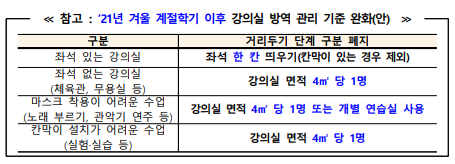 한편, ’21년 겨울 계절학기부터는 완화된 강의실 방역관리 기준을 적용하여 대면수업이 적극적으로 확대될 수 있도록 지원한다.
