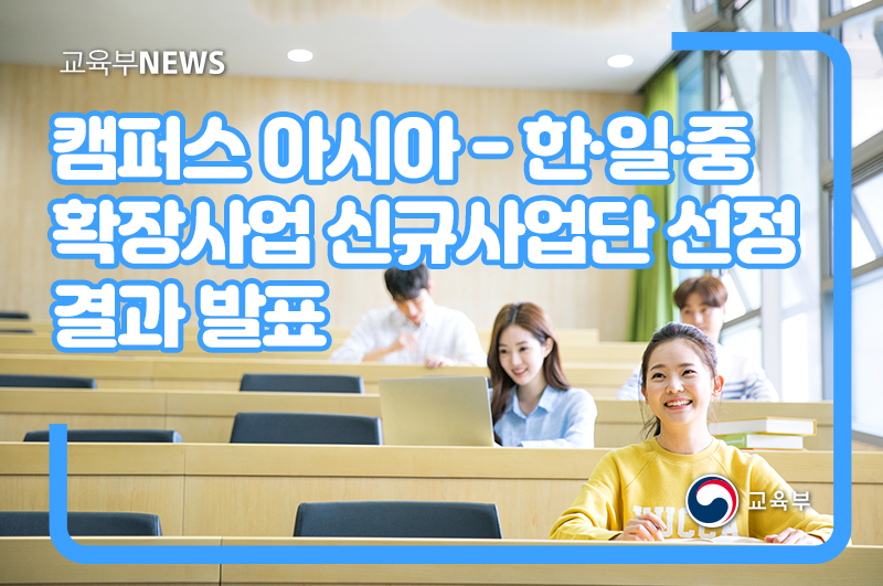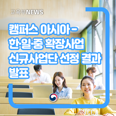 교육부(부총리 겸 교육부장관 유은혜)와 한국대학교육협의회(회장 김인철)는 2021년 캠퍼스 아시아(CAMPUS Asia*) 한·일·중 확장사업 신규 사업단 선정 최종 결과를 11월 2일(화) 발표하였다.