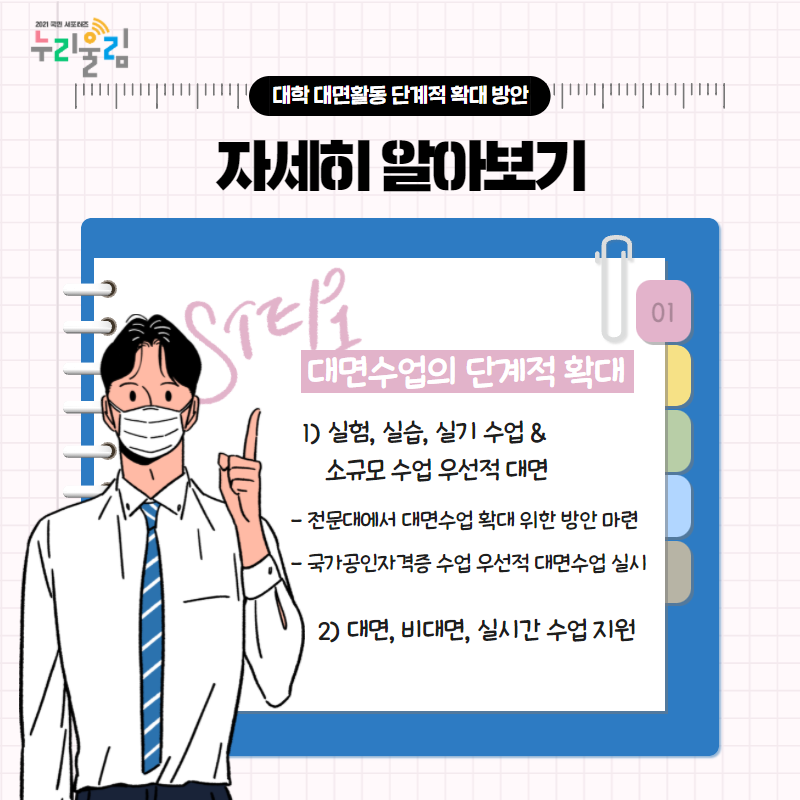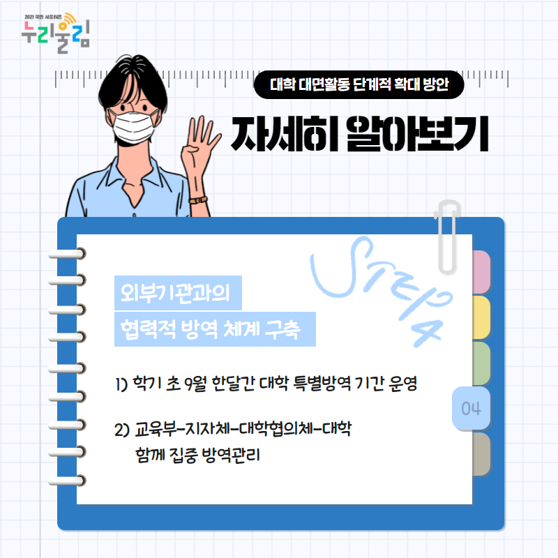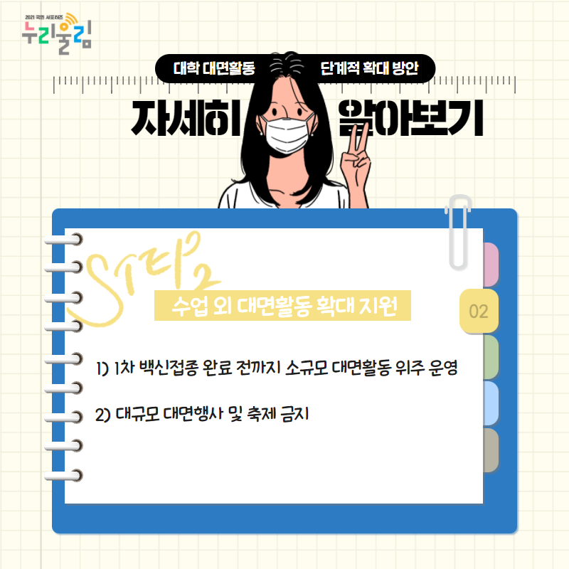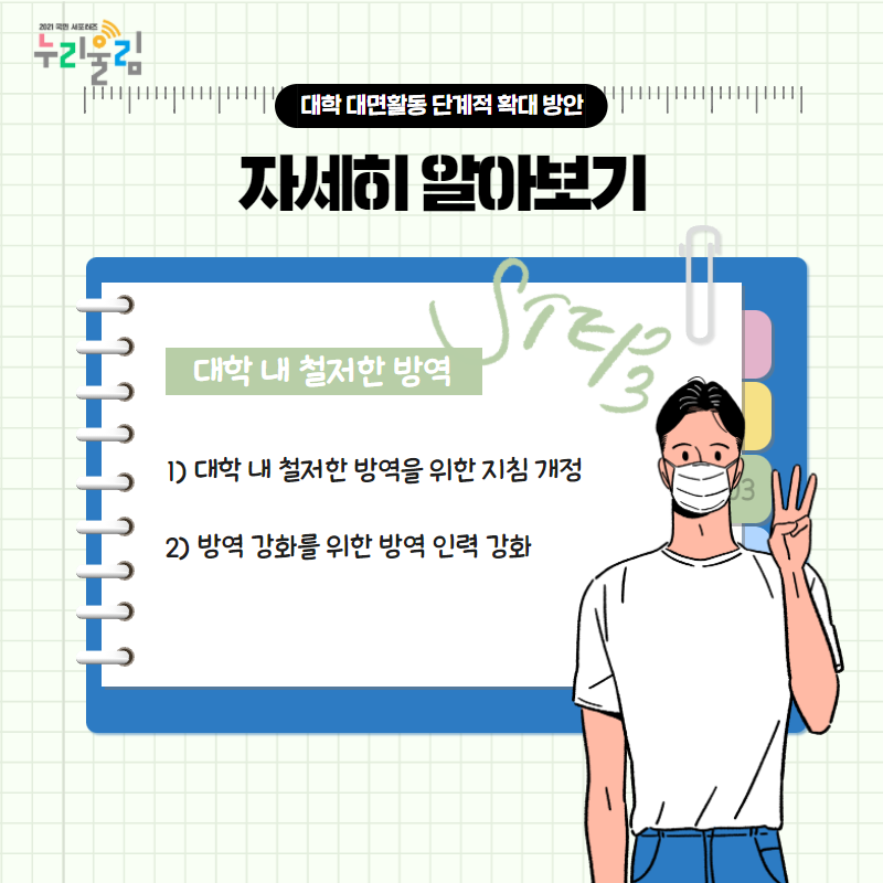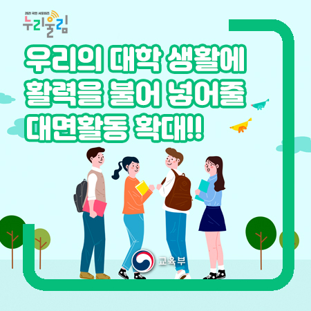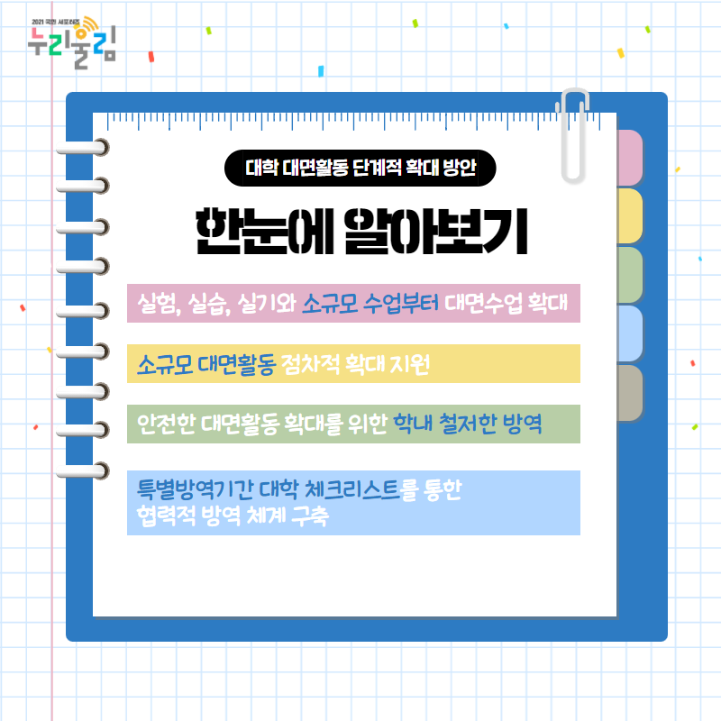 이에 따라 2021년 2학기에도 대학이 안전한 대면 교육활동을 준비 및 운영할 수 있도록 지원이 필요해졌는데요. 이러한 지원 내용을 담은 ‘대학 활동 단계적 확대 방안’이 6월 24일 발표되었고, 최근 고등교육 단계적 일상회복 추진방안 발표에 따라 앞으로 운영될 예정이라고 합니다. 그런데 ‘대학 활동 단계적 확대 방안’이 정확히 어떤 내용인지 잘 모르겠다고요? 걱정하지 마세요. 지금부터 ‘대학 활동 단계적 확대 방안’이 무엇인지 자세히 설명해드릴게요! 그전에 한눈에 요약한 ‘대학 단계적 확대 방안’을 보기로 해요!