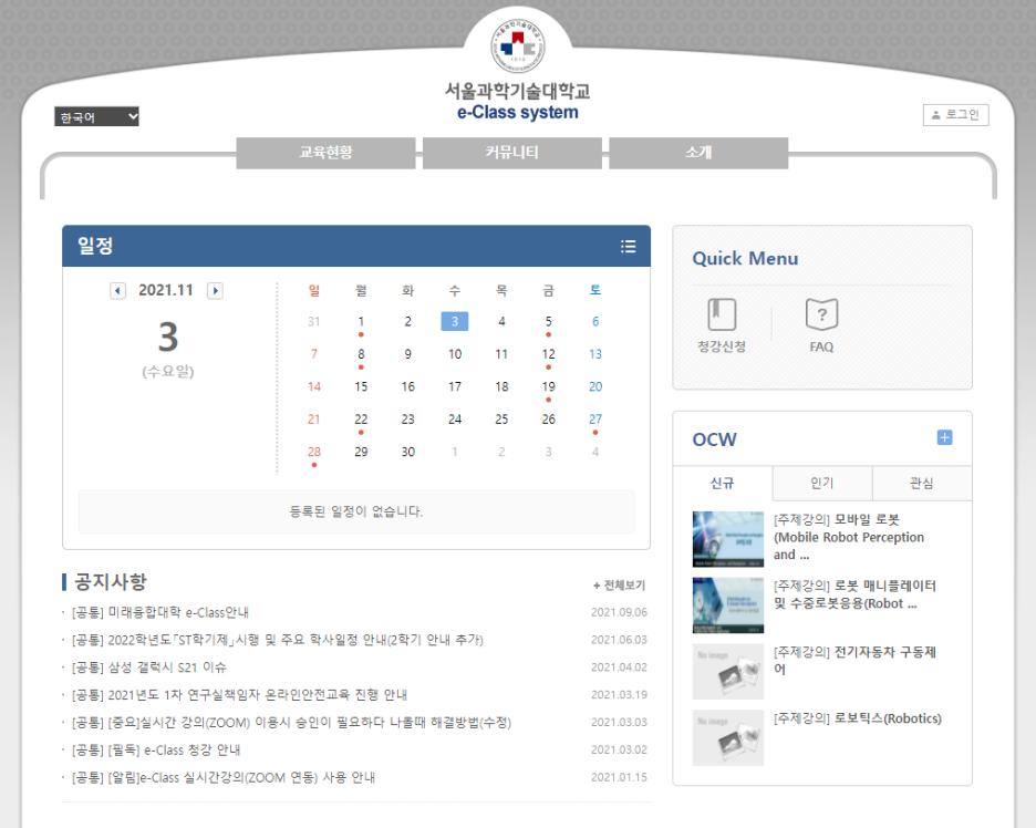 이와 관련해 서울과학기술대학교에서는 학생들의 원활한 원격 수업 수강을 지원하고, 교수-학생과 학생-학생 간의 자료와 의견을 자유롭게 교환할 수 있는 e-class system을 통합적으로 구축했다고 합니다. 특히 온라인 콘텐츠 활용, 실시간 원격강의 등 분야에서 기준을 세워 강의 품질을 높이도록 노력했습니다. 예를 들어, 온라인 콘텐츠는 1차시에 25분 이상의 동영상 콘텐츠, 실시간 원격강의는 1차시에 45~50분 수업을 진행하도록 기준을 만들었다고 해요.