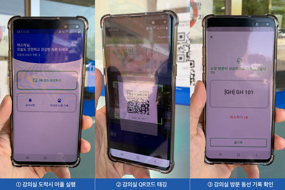 이외에도 학교별로 학내 밀집도와 동선을 알려주는 어플리케이션을 활용하도록 하여 자체적으로 동선 및 공간 분리 등을 할 수 있도록 지원했습니다. 그 예시로 한동대학교의 스팟테일(Spotale) 어플을 들 수 있을 것 같아요. 이 어플은 한동대학교에서 새로 개발한 서비스로, 건물 내 이동 경로를 명확히 파악하는 비접촉식 이동 경로 저장 솔루션 어플리케이션이라고 합니다. 스팟테일은 기존 GPS 기반 방식의 한계를 해결하면서 개인 정보 유출 걱정을 덜 수 있도록 사용자가 자발적으로 스캔할 수 있는 QR코드 방식을 채택했는데요. 방법은 간단합니다. 학교는 장소, 사물 등 관리하고자 하는 스팟을 등록하고 자동으로 생성되는 QR코드를 인쇄해 해당 위치에 부착합니다. 학생들은 앱을 통해 스팟을 이용할 때마다 QR코드를 스캔하여 본인의 동선을 기록하고, 만약 스캔한 곳에서 전염병 등 중요한 공지가 발생되면 실시간 푸시 알림을 통해 소식을 빠르게 받아볼 수 있다고 하네요. 이 방식은 많은 사람들이 움직이는 대학교에 꼭 필요한 방식인 것 같습니다.