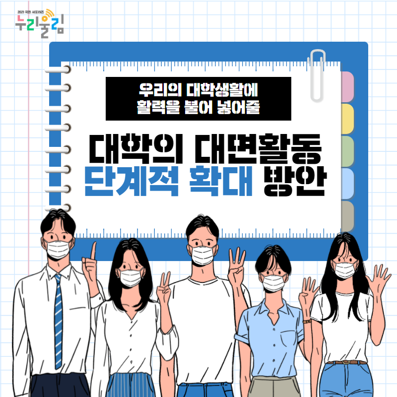 대학생들은 비대면 수업으로 인해 대학 생활을 누리지 못하는 경우가 허다하며, 수업에서도 활동의 제한으로 원활한 학습이 제한되고 있는 상황입니다. 코로나 상황이 지속되고 있지만, 오늘 소개한 <대학 단계적 확대 방안>과 같이 다양한 방면에서 철저하고, 촘촘히 준비한 것들을 바탕으로 대면 수업이 점차 확대되고 있습니다. 또한, 추가로 발표된 <교육분야 단계적 일상회복 추진방안>을 통해 일상회복에 한걸음 더 다가갈 수 있게 되었어요. 올해 말, 그리고 내년부터는 많은 학생들이 좀 더 자유롭게 교육을 받을 미래를 기대하며 이만 기사를 마치도록 하겠습니다.