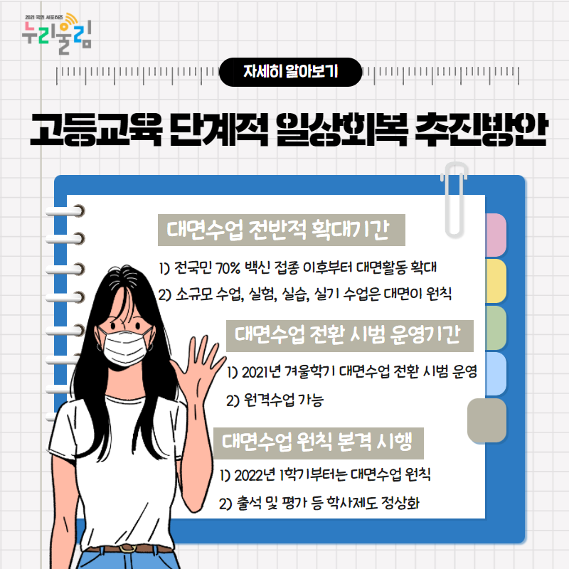 지속되고 있는 코로나19 상황에서 대학생 여러분들 중에 지금까지 비대면 수업을 하면서 대학 생활을 즐기지 못하는 분들이 많으실 것 같아요. 유치원, 초등학교, 중학교, 고등학교는 코로나19가 지속됨에 따라 교육격차와 교사와 학생과의 소통 문제, 사회적 발달 저하 문제 등 다양한 결손으로 인해 교육 회복의 중요성이 커지게 되면서 등교 수업 확대를 추진하게 되었습니다. 등교 수업 확대에 대한 우려에 대응하기 위해 방역 진행 상황과 백신접종과 같은 여러 상황을 고려해서 방역 강화 조치를 마련하며 체계적으로 등교 수업 확대를 하고 있는데요.