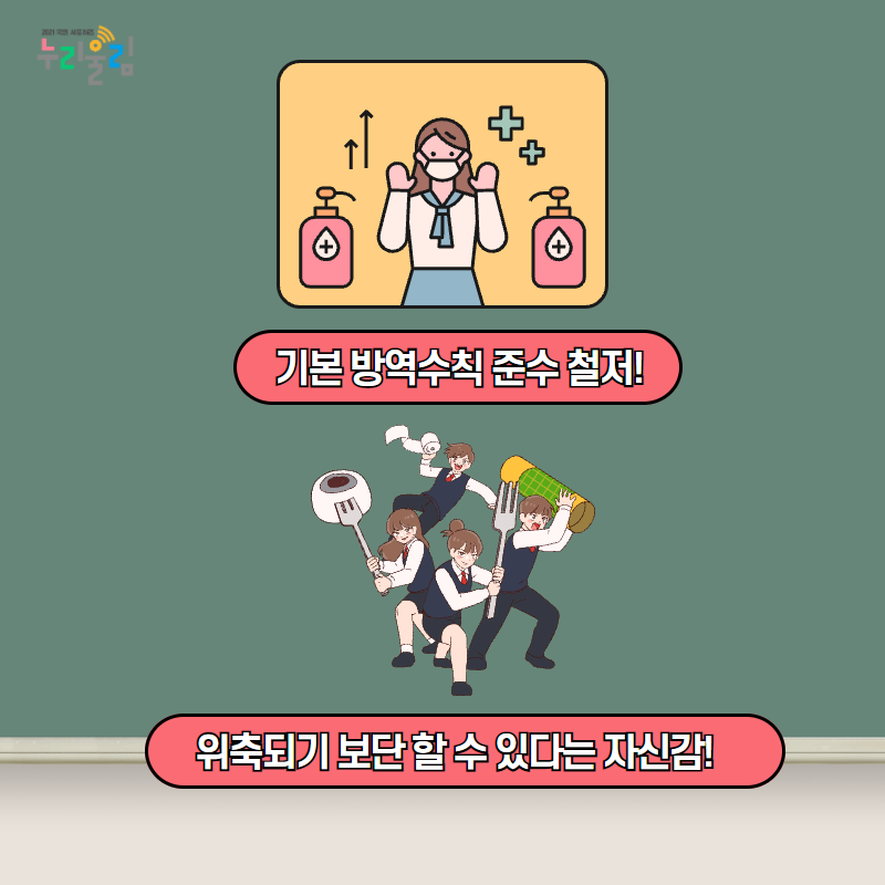 여러분들의 안전한 시험을 위해, 시험장 내에 기본적인 방역물품을 구비하고, 쉬는 시간과 점심시간에는 창문을 개방하여 환기를 실시하는 등 철저한 방역을 통해 수험생들의 안전한 수능을 위한 여러 노력을 기울일 예정입니다.