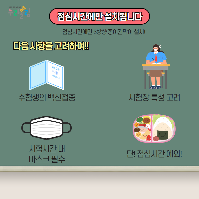 시험장에서 마스크 의무 착용은 기본이고, 수능 시험장의 특성상 대화를 하지 않는 상황과 수험생들의 백신 접종률을 고려하여 시험 시간에는 3면 칸막이가 설치되지 않는다고 합니다. 다만, 수험생들이 점심을 먹는 시간에는 마스크를 벗기 때문에 안전을 위해 3면 칸막이가 설치됩니다. 원활한 수험환경을 위해, 배려해준 만큼, 쉬는 시간 등에 다른 친구와 얘기하는 등의 위험한 행동은 STOP! 해야겠죠?