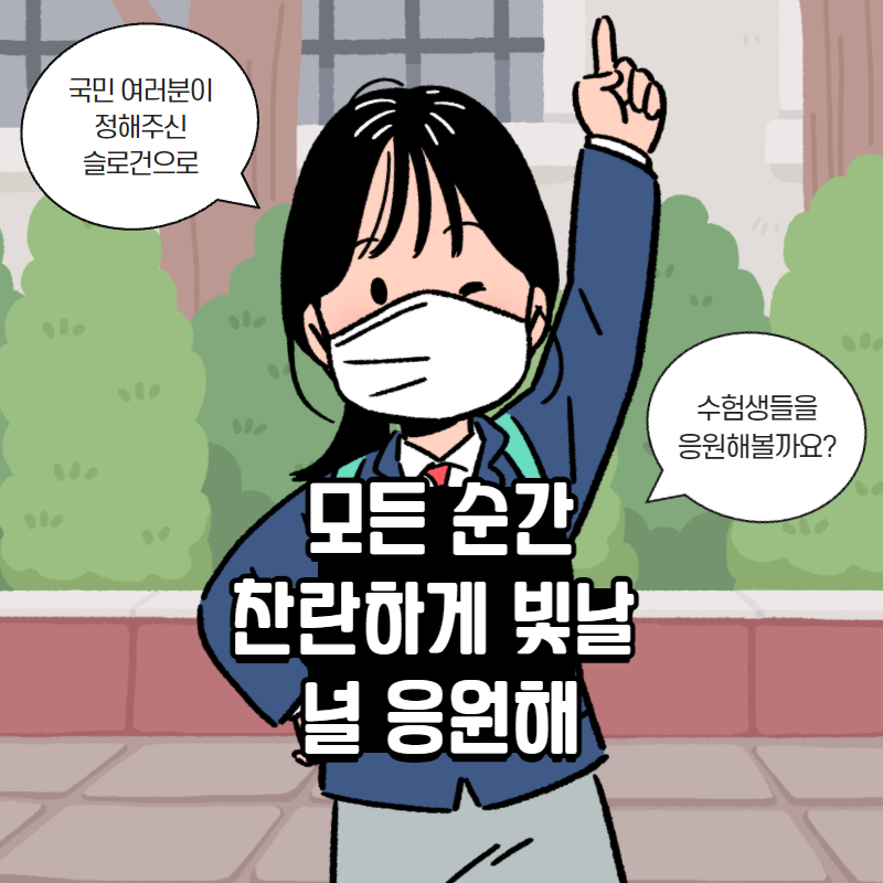 수험생 여러분, 비록 코로나19라는 상황에서 진행되기 때문에 더 불안하고, 위축될 수 있을 것 같습니다. 그럼에도 여러분이 지금까지 꿈을 이루기 위해 열심히 달려온 과정을 잊지 말고, 11월 18일, 여러분이 준비해온 모든 것을 다 보여주시면 좋겠습니다. 그럼 마지막으로 국민 여러분이 정해주신 응원 슬로건으로 함께 응원해볼까요?