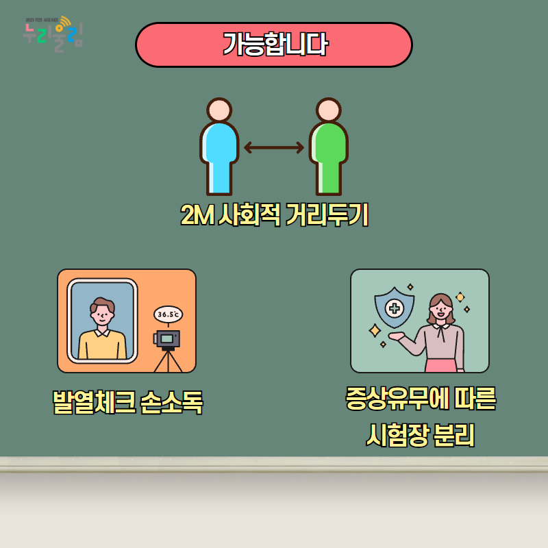 물론! 가능합니다. 단계적 일상회복으로 향하고 있지만, 그러기 위해서는 우리 모두 안전한 “사회적 거리두기” 실천하기! 잊지 않으셨죠? 수험장에서도 동일하게 적용됩니다! 일반 수험생과 격리 수험생들은 입실 전, 발열검사를 실시하고, 마스크 착용을 반드시 해야 하며, 증상이 있는 경우에 각 고사장 내 별도 시험실에서 응시를 하게 됩니다. 또한, 별도 시험실에서는 수험생 간 간격을 2m 이상 유지하여 감염 가능성을 낮춥니다.